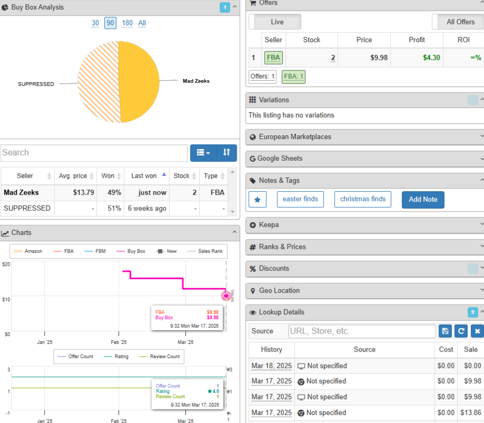 This panel gives real-time information on price, fulfilment and Buy Box changes. In this example, you can see the price in Charts for the FBA seller in the Offers tab is currently showing as $9.98, as well as the offer count and rating of the product. The Charts is a great tool to give you play-by-play events on a specific day and time.